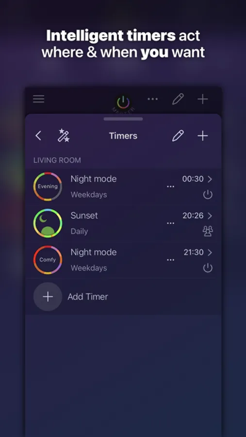 • Intelligent timers: Start them by time and day, by condition (group on/off or presence - w/ optional Automation), use colors & scenes, use random offsets, use sunrise or sunset time