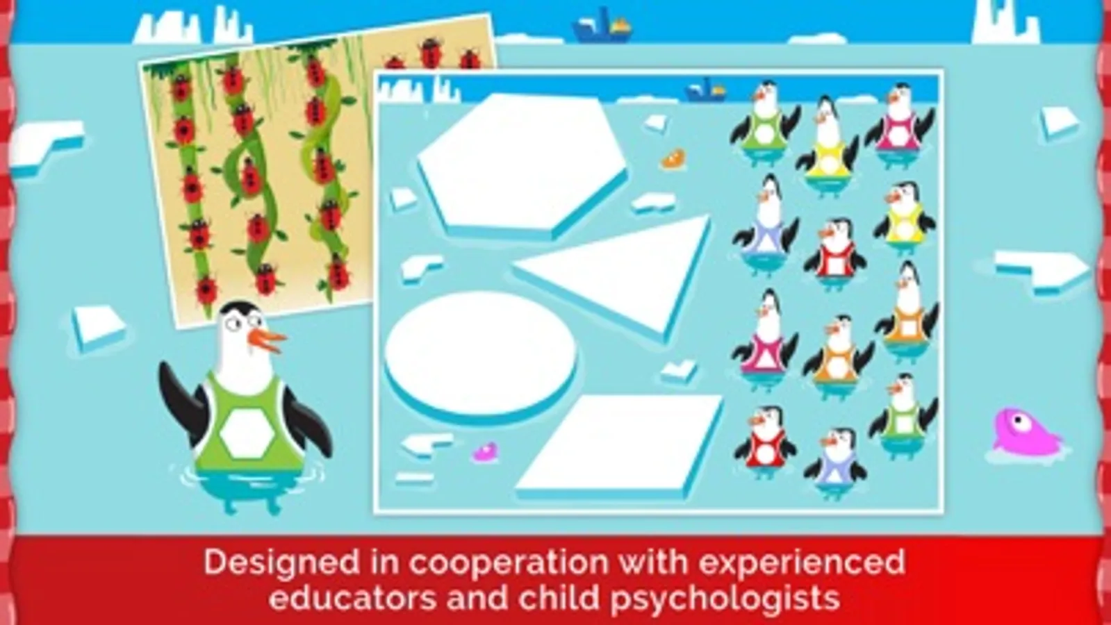 This game is intended for toddlers aged 3+. The game presents 12 boards each focused on developing a set of basic concepts such as size, colors, numbers and patterns using everyday objects from the child's world such as clothes, food and many more.