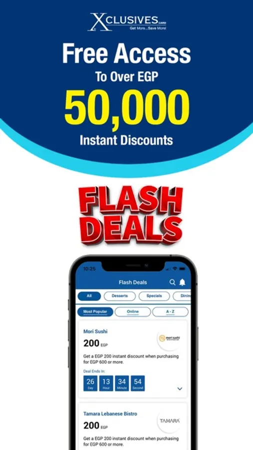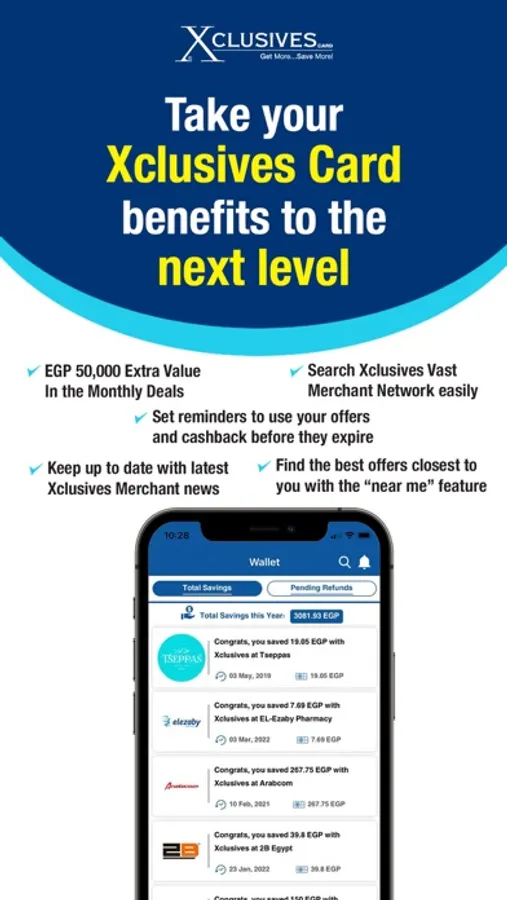 - For Xclusives cardmembers, the Xclusives app is a valuable tool to browse the vast merchant network easily. Linking Xclusives card to the app unlocks the monthly-deals section of the app, with up to EGP 50,000 more in instant discounts.