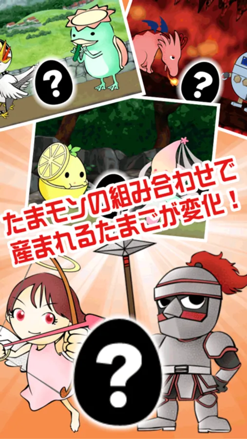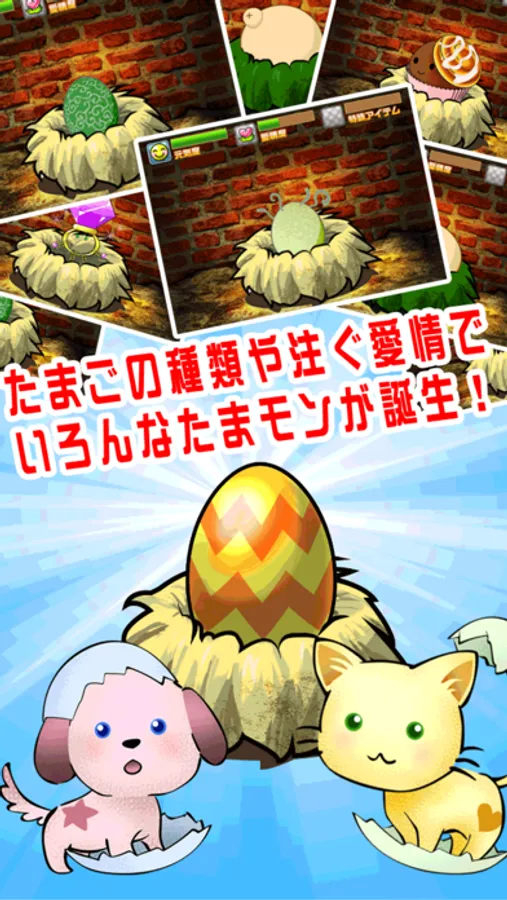 産まれた「たまモン」2匹の掛け合わせ方や、たまご・牧場の環境を変えることで、様々な「たまモン」が産まれてきます。