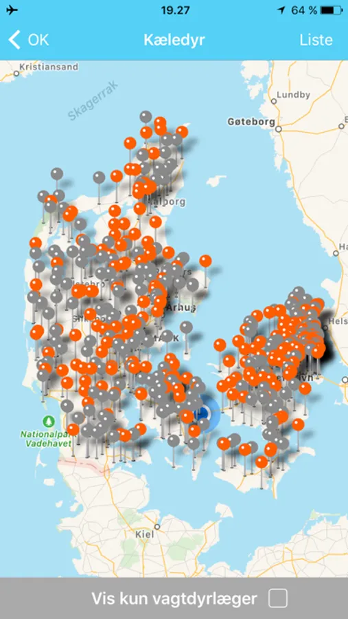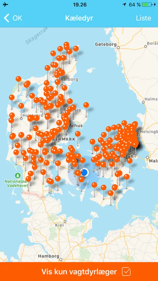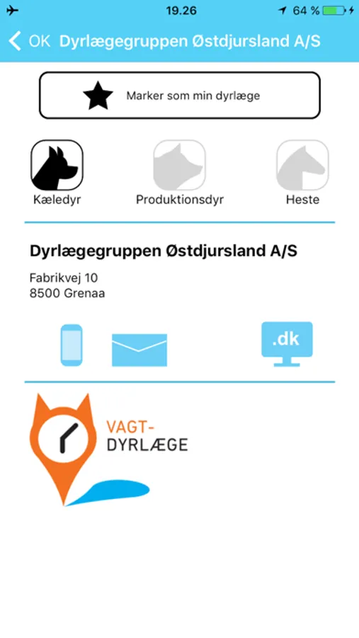 Find dyrlæge viser vej til nærmeste dyrlæge. Her kan du se adresse, telefon, e-mail og du kan få en rutebeskrivelse til dyrlægen. Du kan søge specifikt på dyregrupper som fx produktionsdyr, familiedyr og heste.