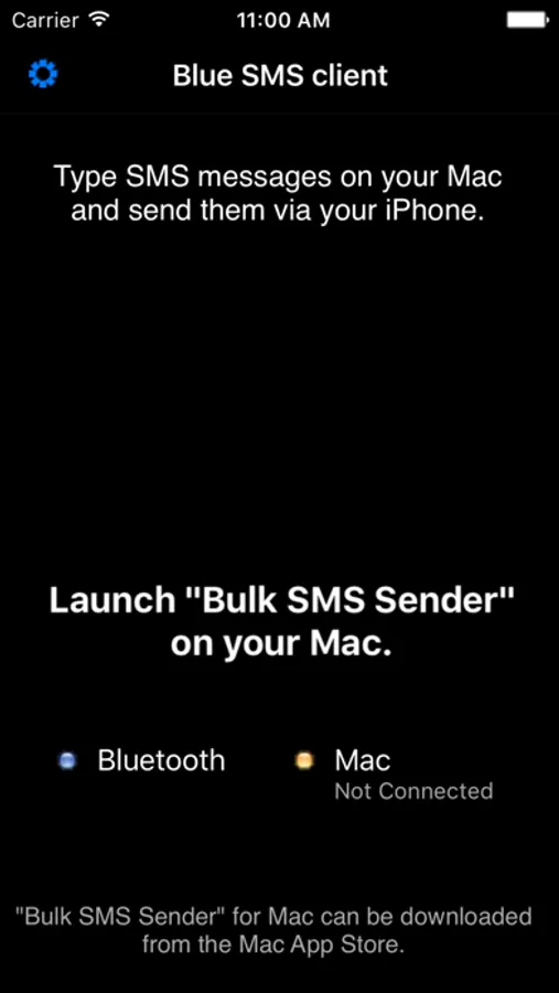 This iPhone client application requires the Mac version of "Bulk SMS Sender", which can be downloaded from the App Store. Bluetooth connection is used.
