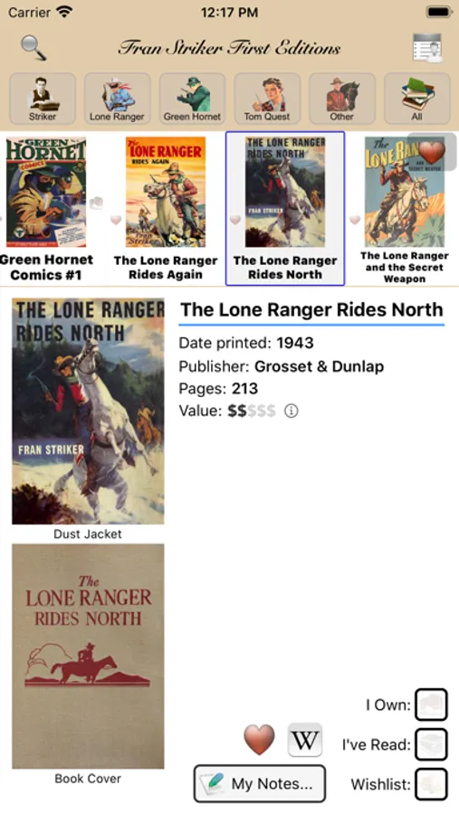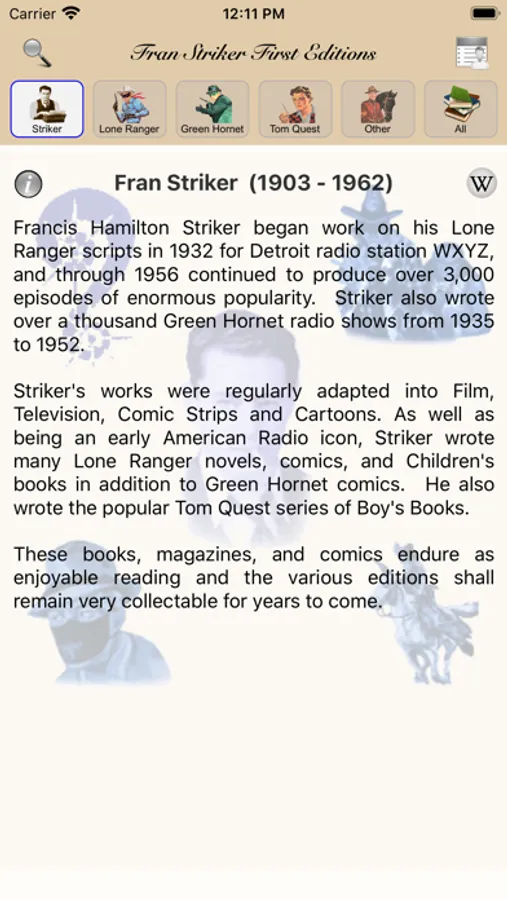 Book and comic collectors, dealers, investors, and Fiction aficionados can quickly view images and details on the initial editions of the entire Fran Striker bibliography - including books, magazines, and comics of The Lone Ranger, The Green Hornet, the Tom Quest boy's books series, and other works.