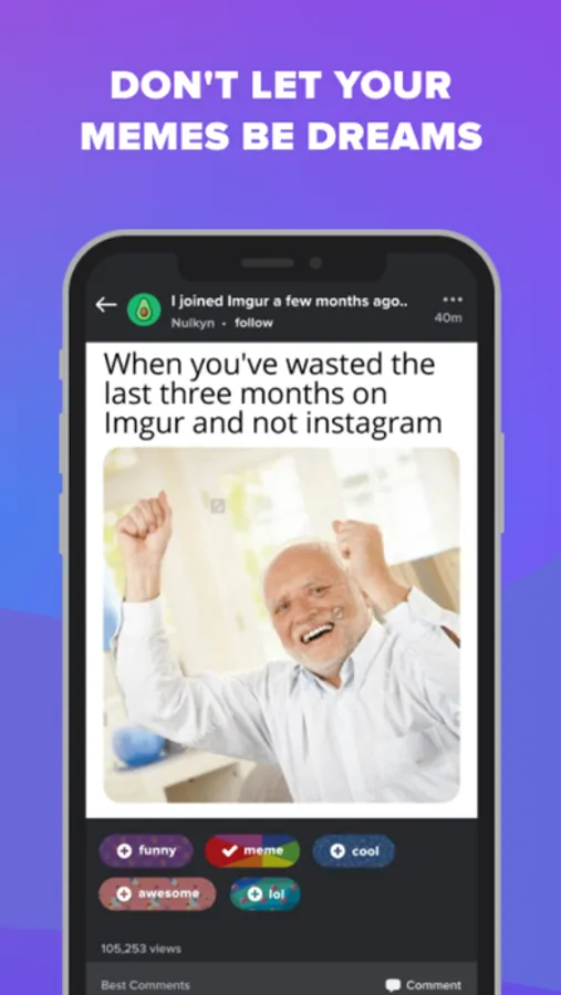 Imgur is the easiest way to discover spicy memes, pets in sweaters, awe-inspiring science facts, video game Easter eggs, and all the rest of the Internet’s most entertaining stuff. Your phone is about to get a whole lot funnier.