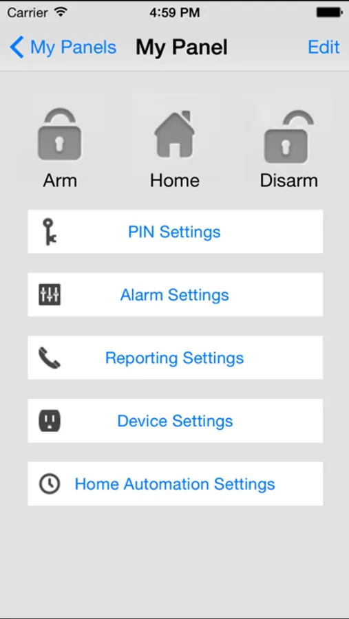 The Connect2Home app is designed for you to control your alarm system through your iPhone. You can use the app to remotely control your alarm system through SMS message. The app supports complete system programming and operation functions, including:
