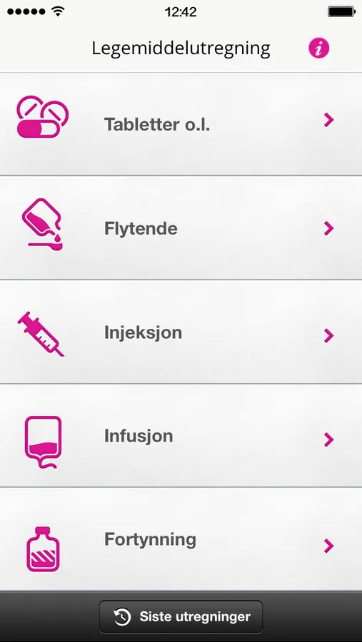 Appen "Legemiddelutregning" er et praktisk verktøy og hjelpemiddel for helsepersonell. «Legemiddelutregning» tar utgangspunkt i aktuell legemiddelform (injeksjon, infusjon, tabletter/kapsler ol.) og veileder brukeren trinnvis frem til riktig svar.