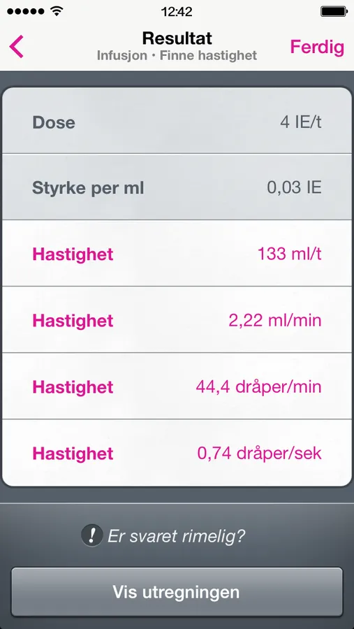 Helsepersonell må alltid vurdere om svaret er rimelig. Legemiddelutregninger bør alltid dobbeltkontrolleres. Appen er et hjelpemiddel og endrer ikke helsepersonells ansvar knyttet til eventuell feilmedisinering.