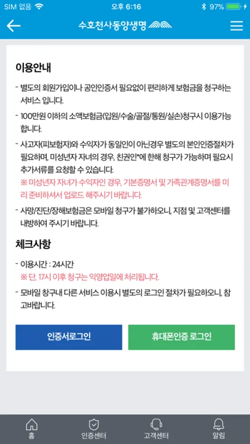 - 사고보험금 메뉴에서 카메라를 이용하여 첨부파일을 제공받기 위하여 카메라 접근 허용이 필요합니다.