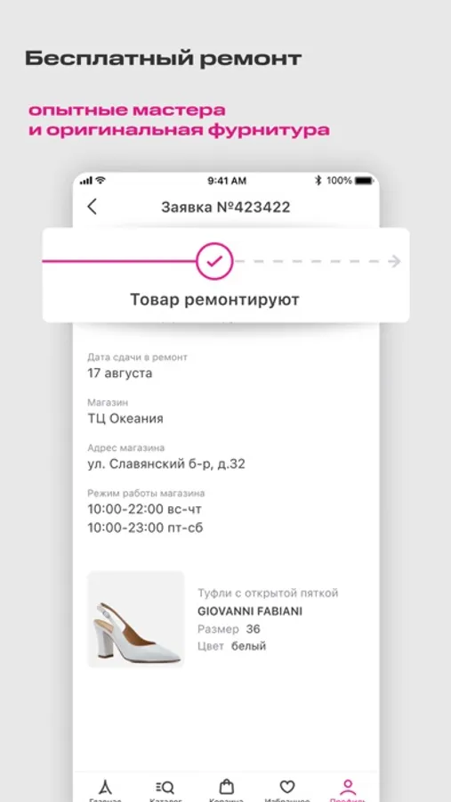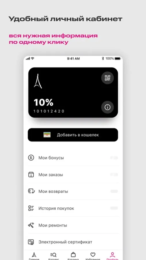 Вся информация о ваших покупках, состоянии бонусного счета, добавление товаров в избранное, возможность отслеживания изменения цен для выбранных моделей и оповещения о новых поступлениях и выгодных акциях.