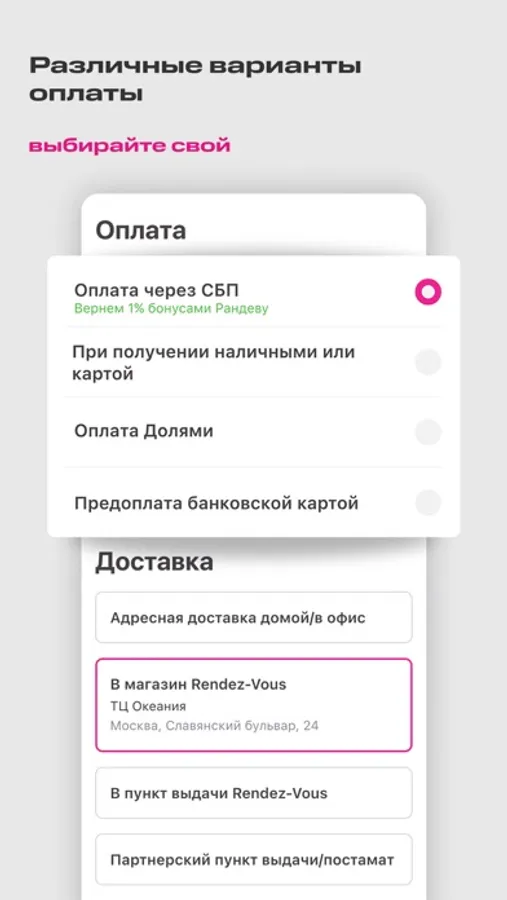 Вы можете оплатить покупку удобным способом: наличными при получении, банковской картой, через систему быстрых платежей (СБП) или с помощью сервиса «Долями».
