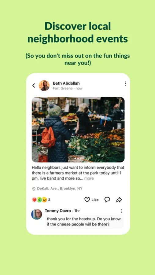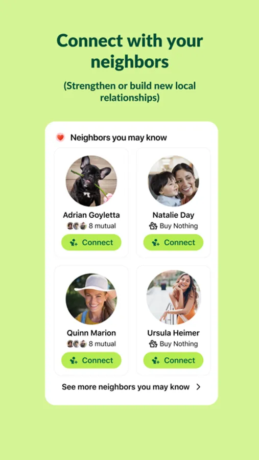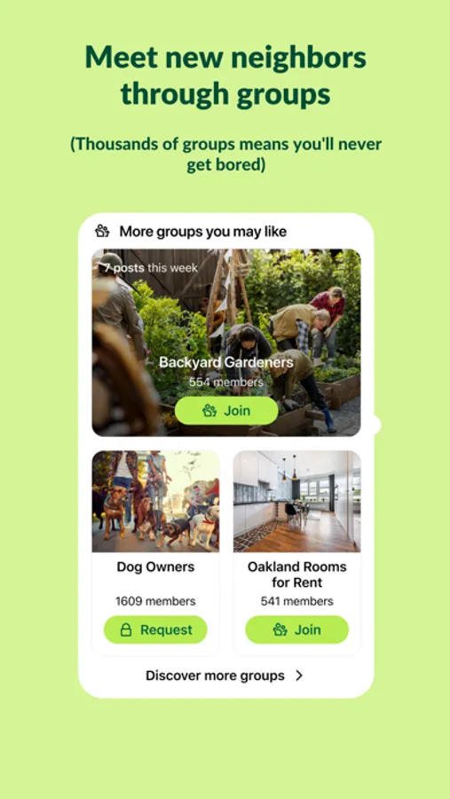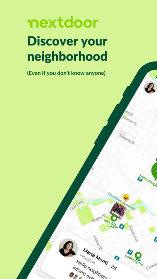 Get the most from your neighborhood. Use Nextdoor to connect with your neighbors, discover new places nearby, join groups, and find recommendations for local businesses. Search For Sale & Free, Nextdoor’s local marketplace, to buy and sell used items. Connect with parents, organize play dates, and bond over shared interests.