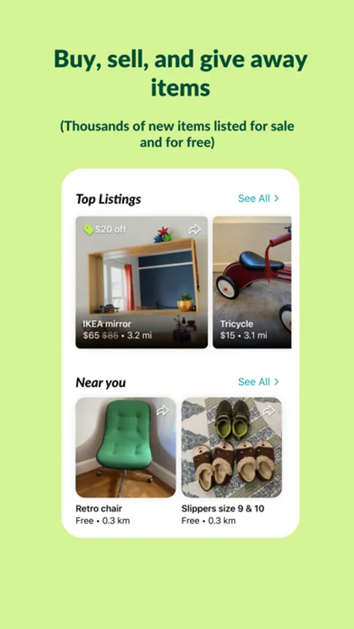 • Buy, sell and trade used stuff—furniture, clothes, cars, and more