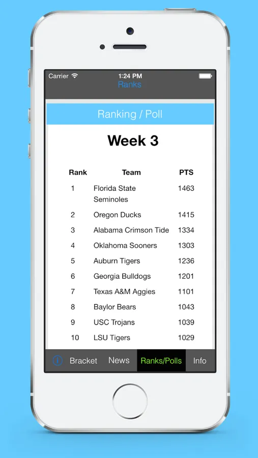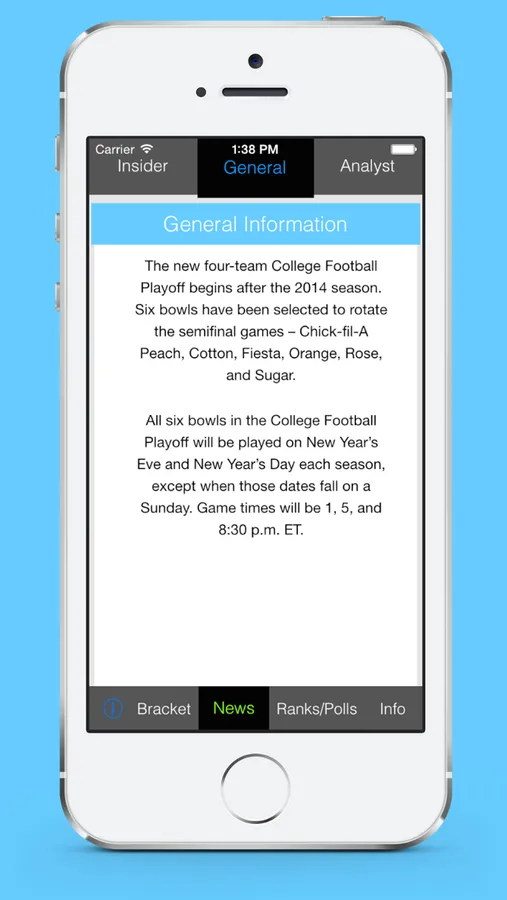 Includes weekly articles from college football analysts. Up to date information on the shaping up of the college football playoff. Includes up to date weekly polling/rating for top 25 teams.