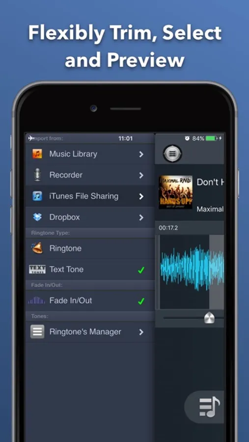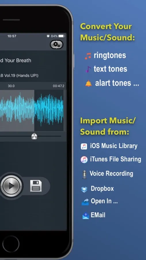 Ringtone Maker App allows you to create unlimited custom ringtones, text tones, and alerts using songs in your music library. Pick a song from your music library on your iPhone, iPad or iPod. Swipe the audio wave to select a short clip. Then save your music as ringtone. It's that easy! You can also easily load music from computers, your Dropbox account or record your own voice.