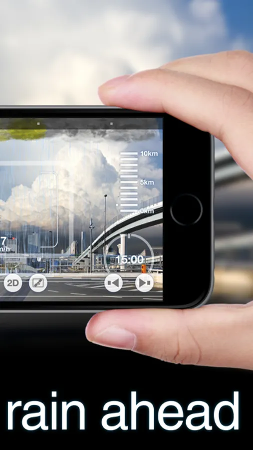 - In 3D mode, rainfall information for a 10km radius is combined with the camera image as an animation of rain clouds, rain, and ripples in puddles. You can read the amount of rainfall by indicating the target direction. It can also play the sound of rain according to the intensity of the rain.