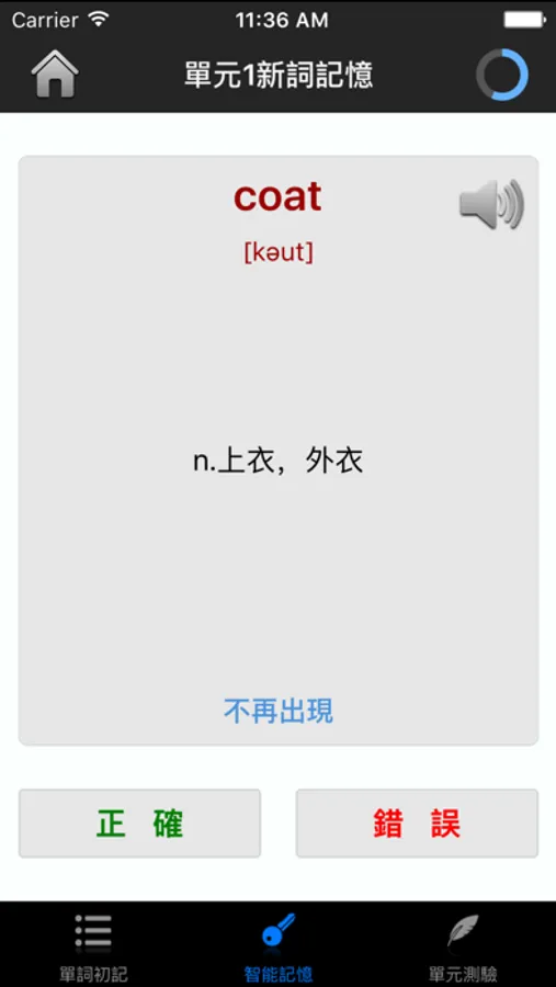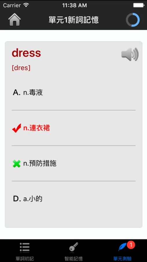 *测试检验:每个单元的单词学习完毕后,系统会自动生成测试题目,您必须在测试中达到至少90%的准确率才能通过测试,否则下一个单元不会开放。此过程确保您学习的有效性,保证每一个记忆点都能最大化巩固。