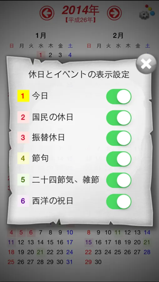 ・国民の祝日、振替休日、二十四節気、雑節、節句、西洋の祝日に色つけします。