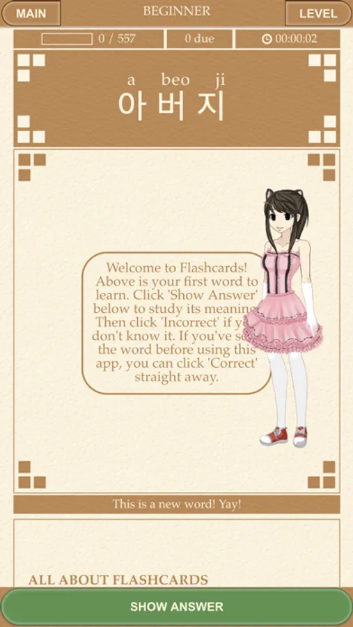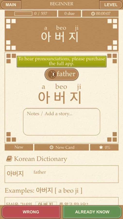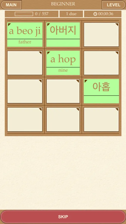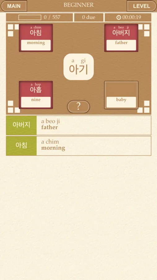 - 6 Korean games: Korean flashcards, Korean multiple choice, Korean tiles, listening flashcards, listening multiple choice, matchup.