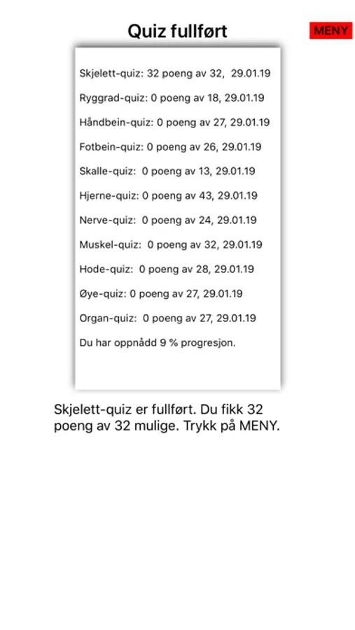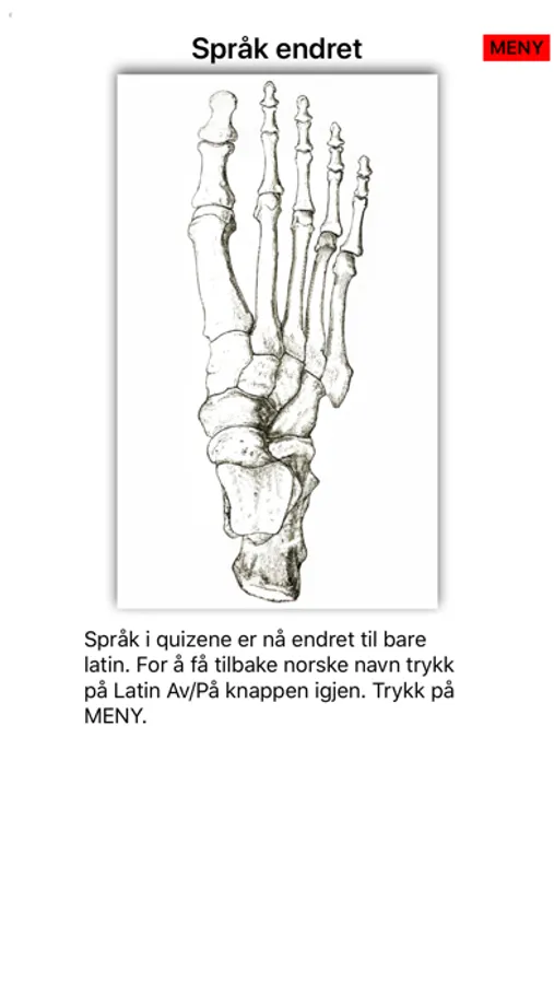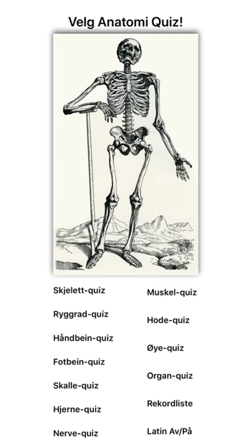 Anatomi på Norsk har over 590 navn på strukturer i skjelett, organer, muskler og hjerne. Quizene er på norsk, men kan kombineres med terminology på latin.