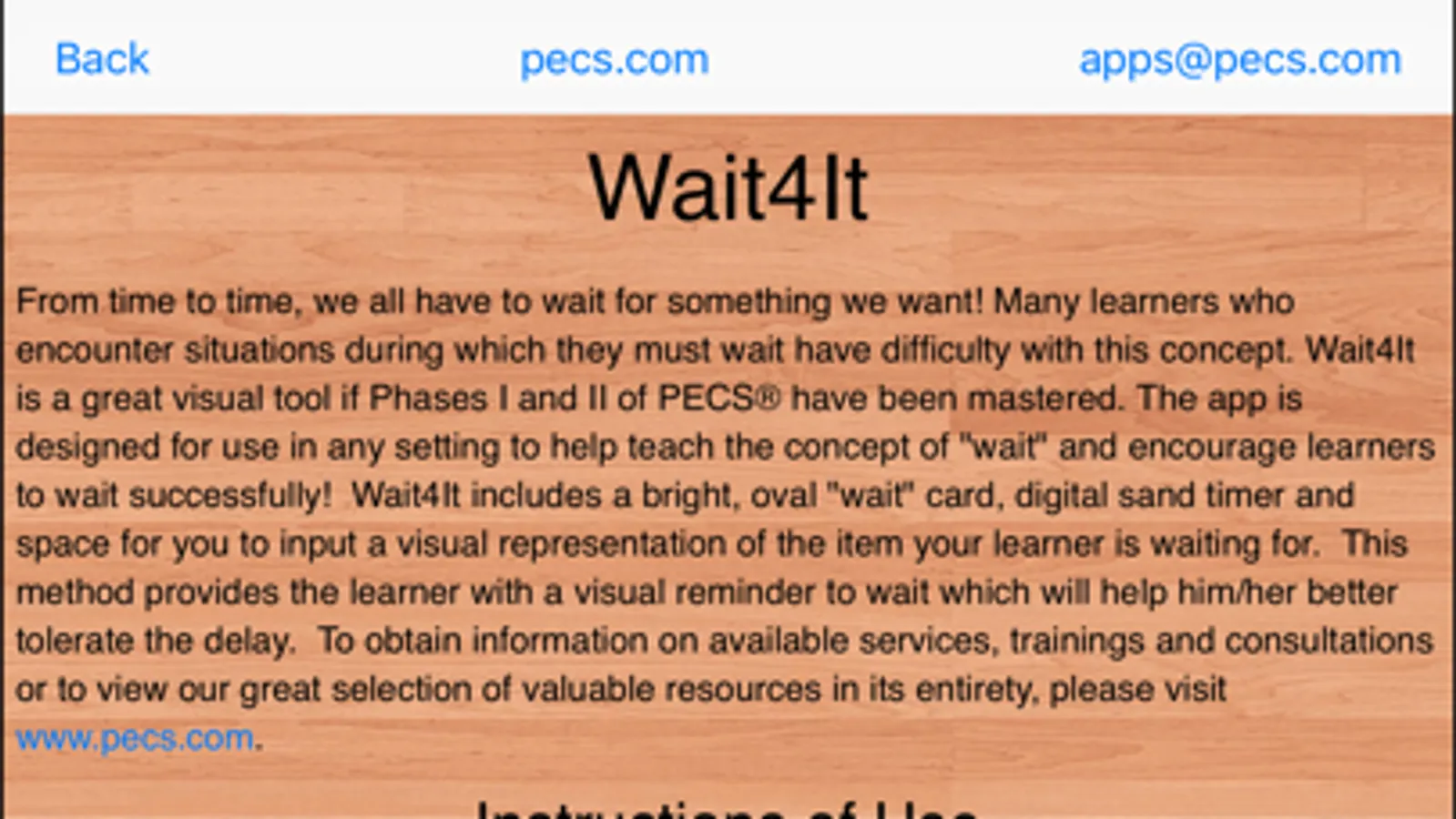 From time to time, we all have to wait for something we want! Many learners who encounter situations during which they must wait have difficulty with this concept. Wait4It is a great visual tool if Phases I and II of PECS® have been mastered. The app is designed for use in any setting to help teach the concept of "wait" and encourage learners to wait successfully! Wait4It includes a bright, oval "wait" card, digital sand timer and space for you to input a visual representation of the item your learner is waiting for. This method provides the learner with a visual reminder to wait which will help him/her better tolerate the delay. To obtain information on available services, trainings and consultations or to view our great selection of valuable resources in its entirety, please visit www.pecs.com.