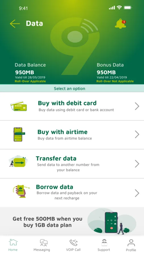 • Data Services: buy, send/transfer, borrow, check balance/usage