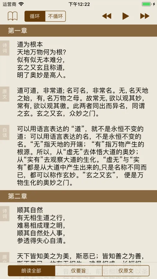 “道德经导读”旨在帮助更多的人成为上士。本软件以通行版《道德经》为蓝本,每章用四句原创诗文阐明大意,配备读音,译文,以便读者全面理解迅速掌握《道德经》的要义,开启人生智慧。