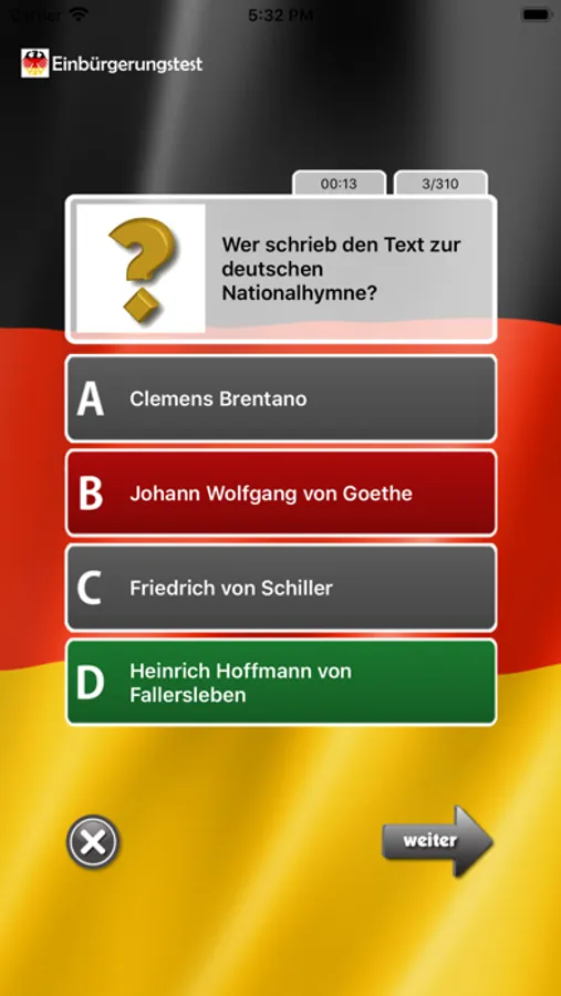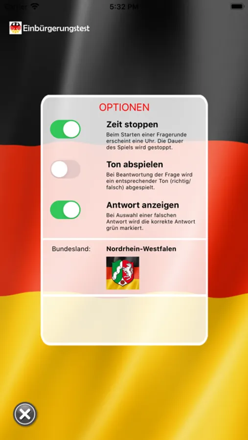 Diese Quiz App enthält alle 300 Grundfragen + 160 Länderfragen des offiziellen Einbürgerungstests der BRD. Zu jeder Frage werden vier Antwortmöglichkeiten vorgegeben, von denen genau eine richtig ist.
