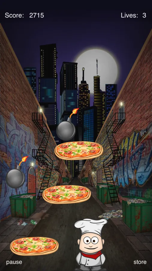 Catch as many pizzas and coins as you can while avoiding the bombs. The more points you score the closer you get to the delivery location.