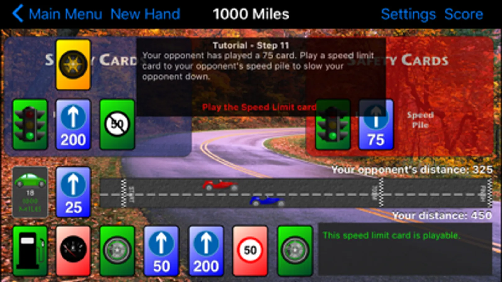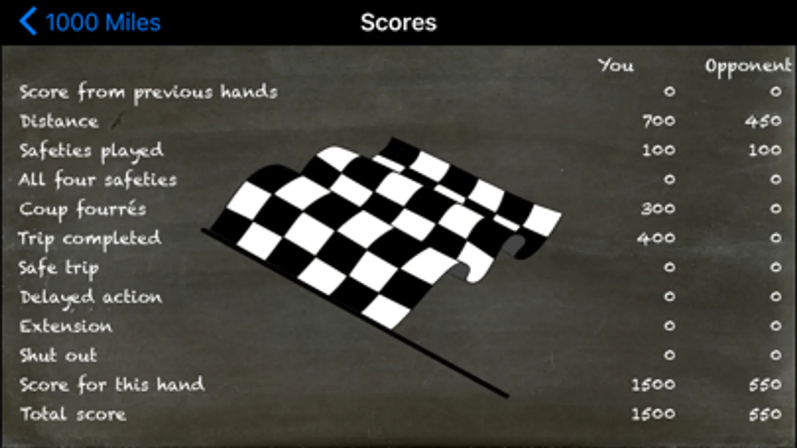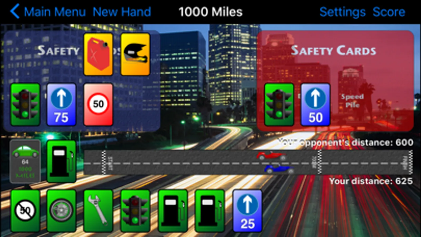 The premise of the game is that you are in a car race. Each hand is either 700 or 1000 miles long, with the first player to reach 700 miles having the option to extend the race to 1000 miles.