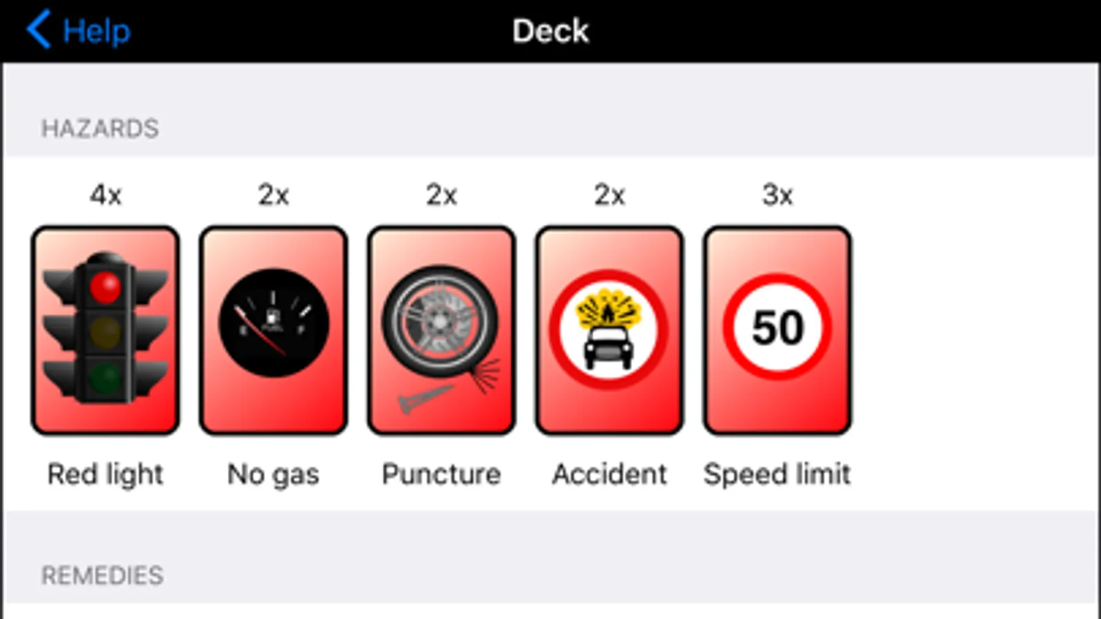 The game uses a special deck of cards which includes distance, hazard, remedy and safety cards. Hazards are played to slow or stop your opponent's progress. Remedies are played to remove hazards applied by your opponent and safeties are used to prevent hazards.