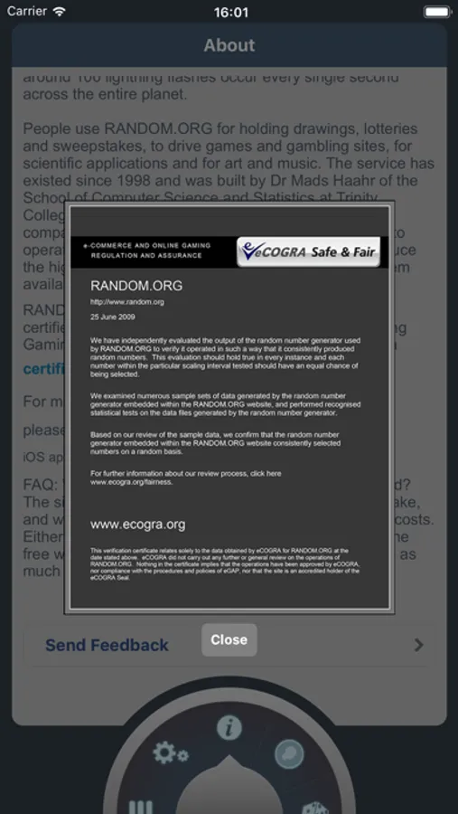 All randomness wasn't created equal. This app offers certified true randomness, generated with atmospheric noise and independently approved by several testing labs. (See sample certificate from eCOGRA.) You can use our website (www.random.org) for free or you can help support us by unlocking the paid randomizers in this official app.