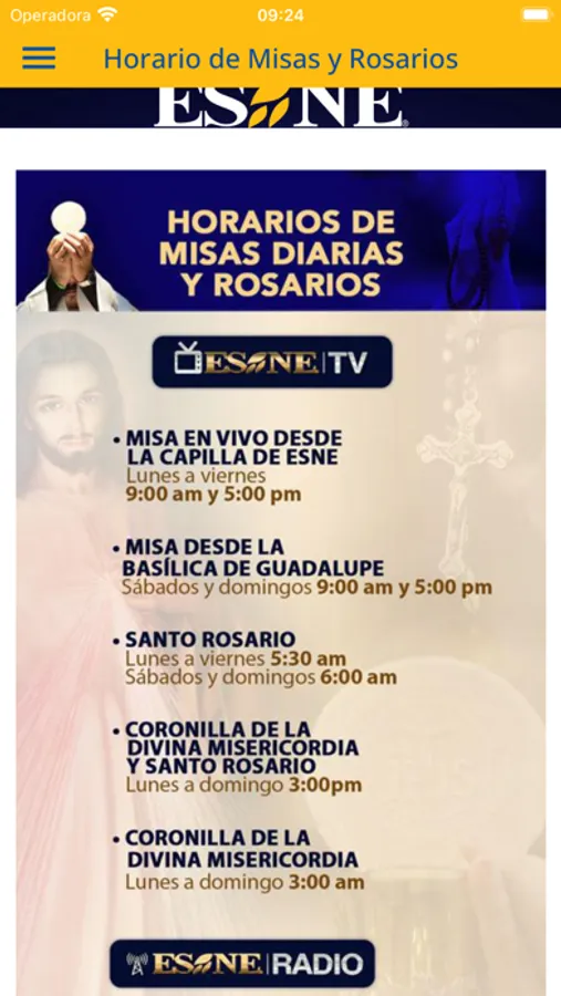 En esta aplicación tendrás toda la programación en vivo de Radio y TV al alcance de tu mano 24/7 y podrás aprovechar nuestros contenidos para tu crecimiento humano y espiritual, unirte en oración con nosotros por medio de El Santo Rosario, la Santa Misa, la Coronilla y los devocionales que aquí encontrarás. Podrás seguirnos en nuestras redes sociales y no olvides suscribirte para que recibas actualizaciones de nuestros eventos, la programación y los mensajes de Noel Díaz, fundador de ESNE y otros beneficios más.
