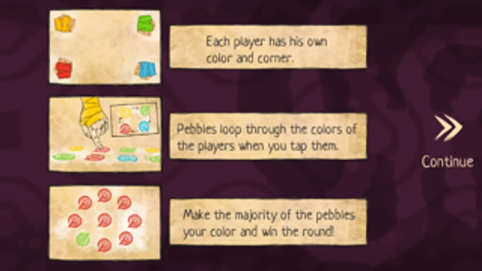 Each player fights for her own color. Pebbles loop through the colors of the players when you tap them. Make the majority of the pebbles your color and win the round. Win five rounds and you’ve secured your victory.