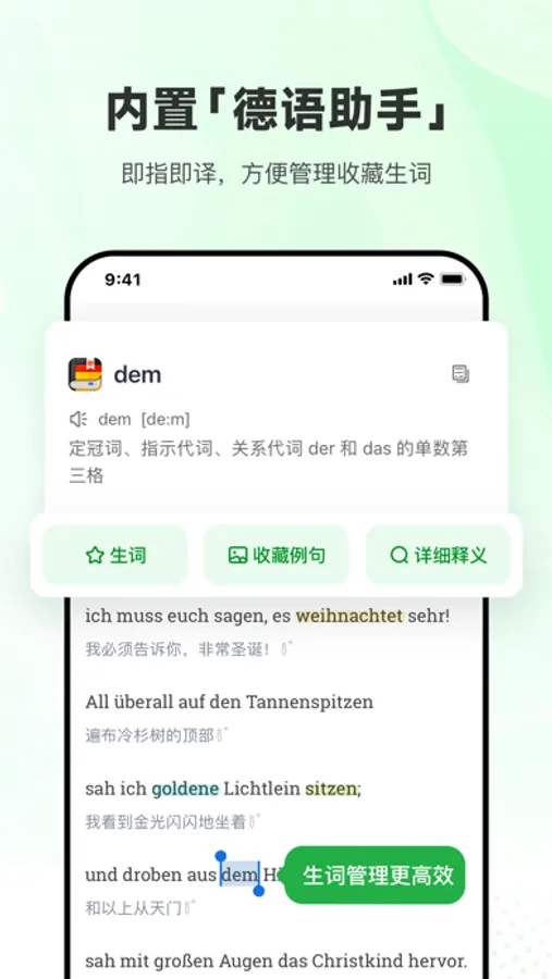 - 与权威的德语词典软件《德语助手》无缝集成,查词典、背单词轻松搞定。
