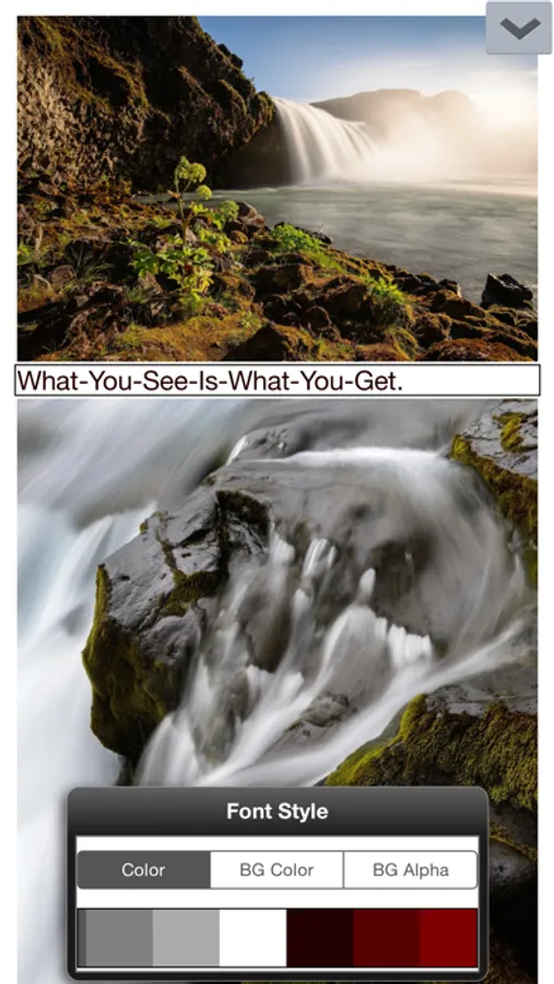 What-You-See-Is-What-You-Get. A special way to share pictures,feelings and thoughts with your friends via Facebook,Twitter,Sina/Tencent or Email. You can also put a series of screen shots from a long conversation in social apps to a continuous long picture, looks like you have a long cellphone screen.