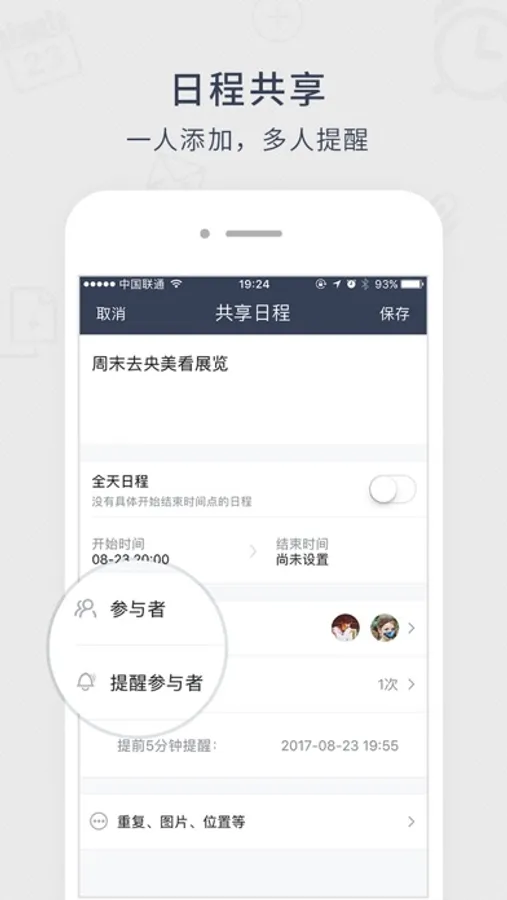 (3)共享:多人日程,多人日历,微信邀请,共享联系人,提醒他人