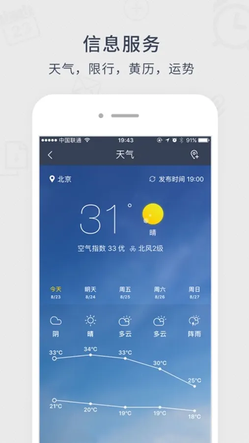 (4)全方位生活信息,天气预报、车辆限行、星座运势、黄历宜忌