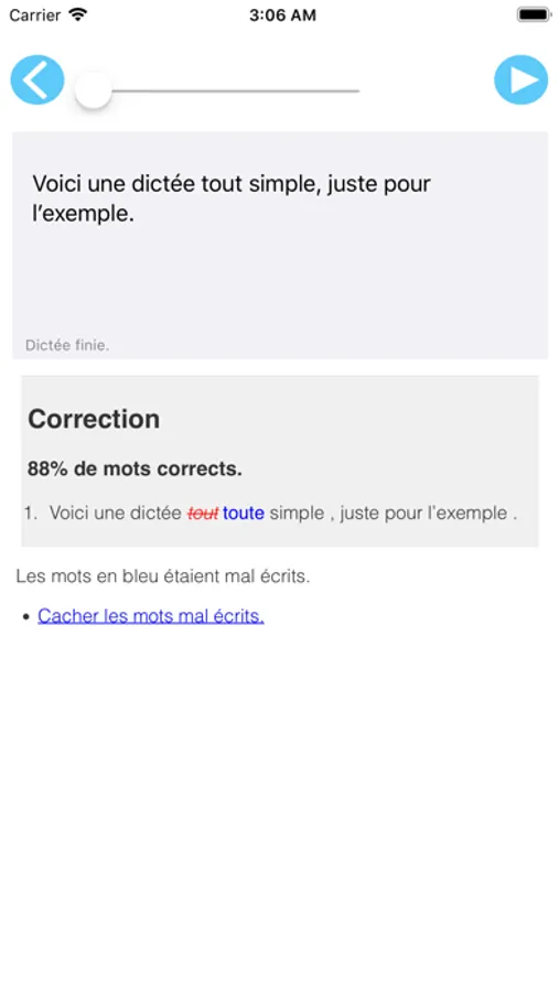 Cette application permet donc aux professeurs ou aux parents de proposer des textes contenant les difficultés orthographiques courantes ou bien celles que l’on sait fréquentes chez l’enfant. On peut ainsi multiplier les chances de corriger une erreur habituelle.