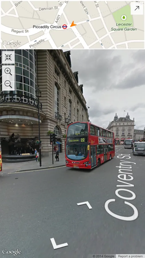 Street view supports zooming in and out, and showing a mini-map overlay. There is also a full screen mode for a more immersive experience.