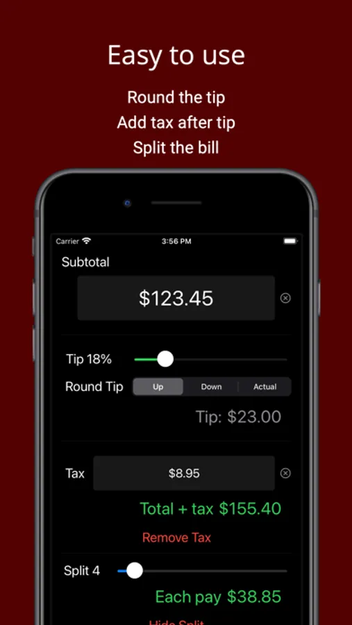 A free tip calculator for quick entry, tip calculation, and splitting the bill. Very easy to input your bill, slide the tip value up/down, and round your tip up or down for easy calculations. Add your bill tax after calculating the tip from the bill subtotal. Each input automatically updates your bill total. The app will remember your previous tip settings (tip percentage and rounding preference).