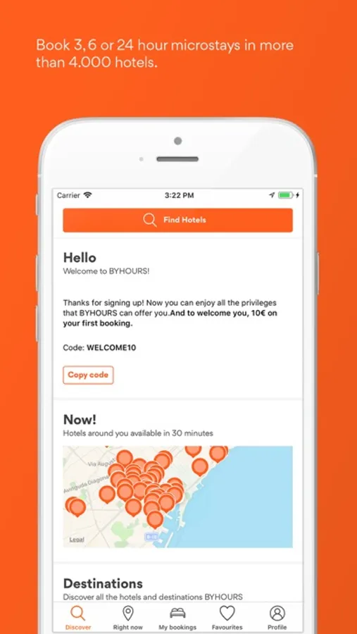 The BYHOURS app is the key to more than 4000 hotels booking for 3, 6 or 24 hours. In our hotels, you can choose the check-in time during the day or night and pay only for the time you need. With your booking, you can enjoy all the services included in the hotel with immediate confirmation and free cancellation.