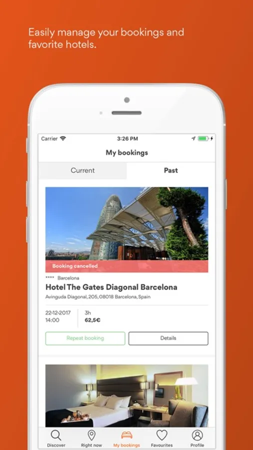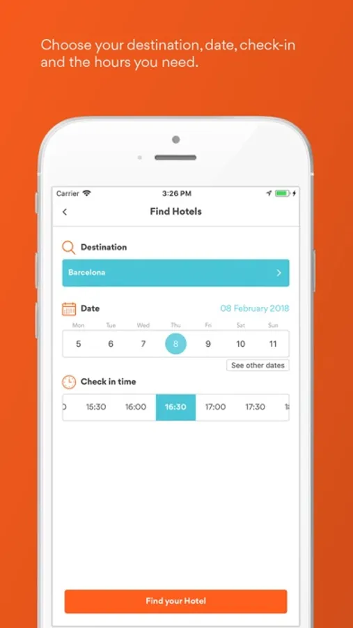 In three simple steps, you can book rooms by the hour in 3, 4 and 5-star hotels worldwide. In the BYHOURS app, you will find independent hotels and the best chains: Sheraton, Hilton, Starwood, Meliá, Silken, Best Western, Hyatt, Barceló, Sercotel, Holiday Inn, Iberostar, NH and many more.