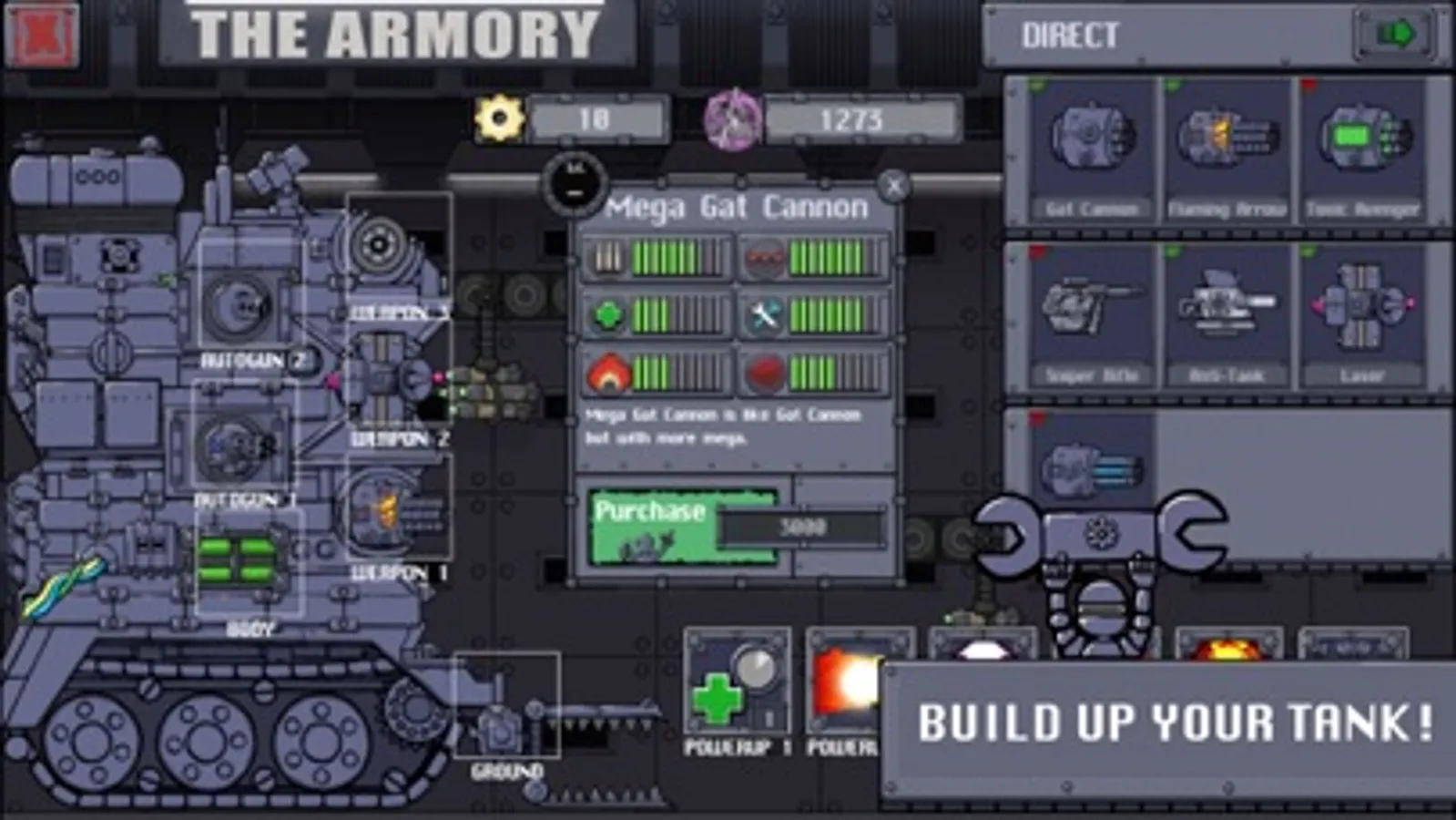-Use Weapons like saw blades, flamethrowers, mortars, grenade launchers, cannons, gatling guns, lasers, missile launchers, smashers, heat rays, and chain lightning to destroy everything in your path!
