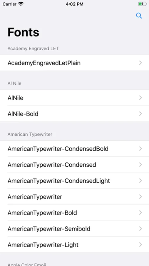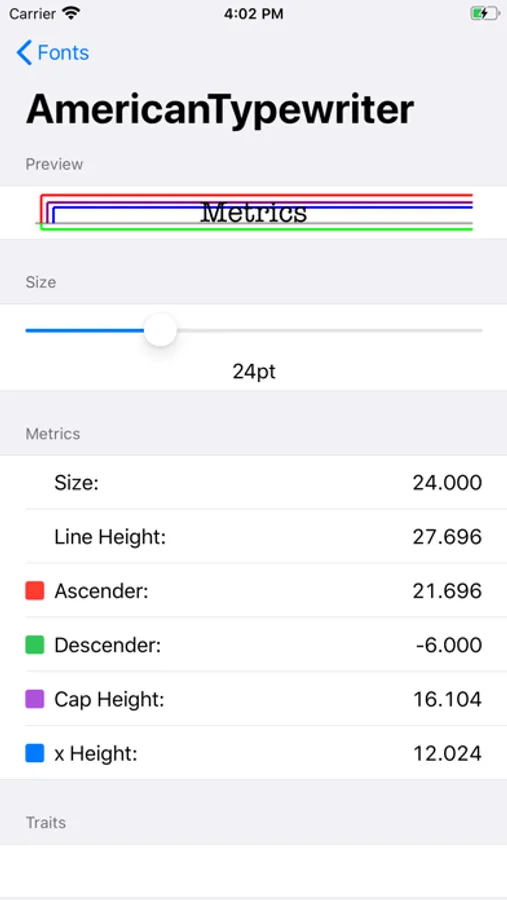 An application to view the metrics of a font. It allows to view values of the fonts provided by iOS and custom ones you can add to the application.