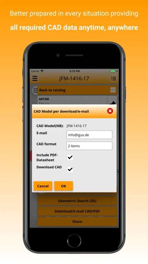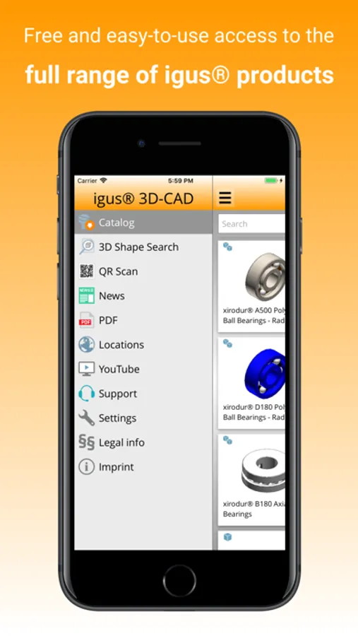 The app provides engineers and buyers from various industries with convenient access to thousands of igus® CAD data and product information for igus® energy chains, iglidur® plastic plain bearings, drylin® linear bearings, igubal® spherical bearings and xiros® plastic ball bearings.