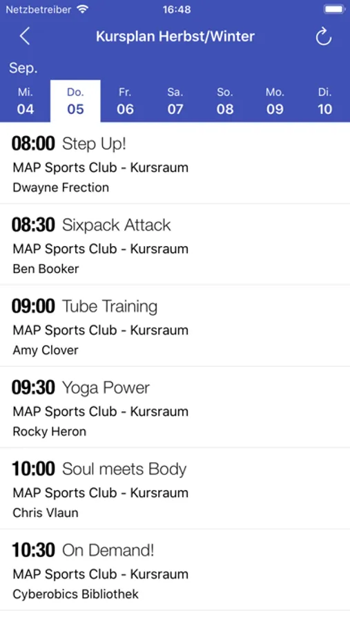 Direkter und aktueller Zugriff auf den Kursplan Ihres MAP SPORTS CLUBS von überall: Für jeden Kurs können Sie Details wie Zeit, Kursbeschreibung, Raum und Merkmale einsehen.