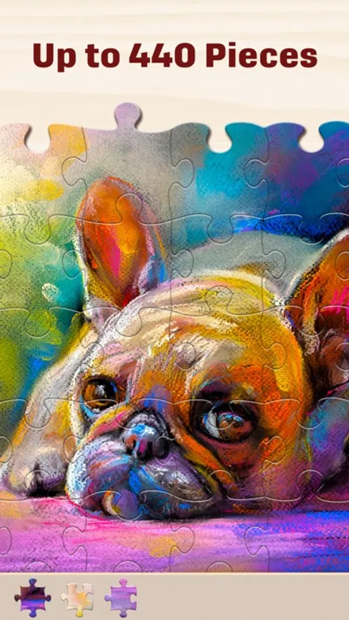 Choose from 12 difficulty levels: from 12 to 440 puzzle pieces. Configure the background color and shape of puzzle pieces. You can turn the rotation of pieces on or off for each puzzle separately.