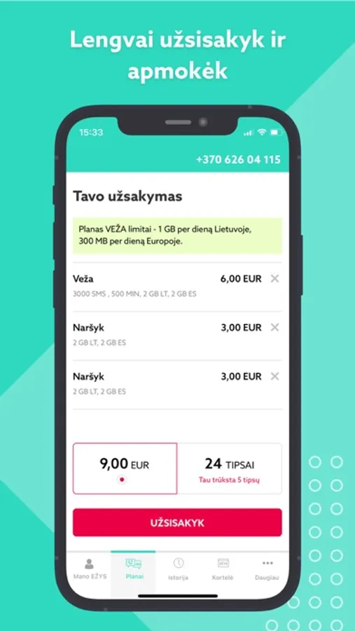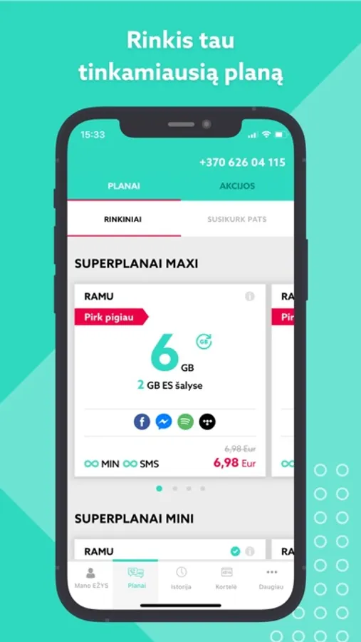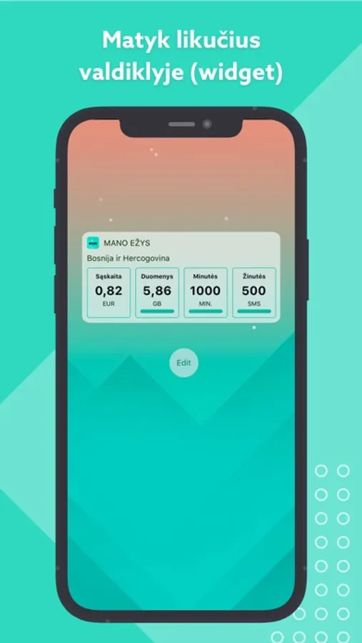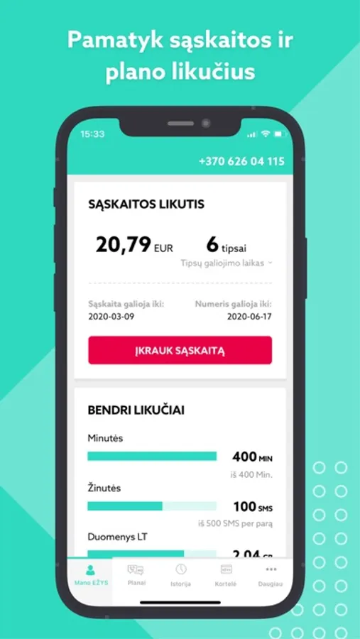 • matyti turimų minučių, SMS ir interneto duomenų likučius;