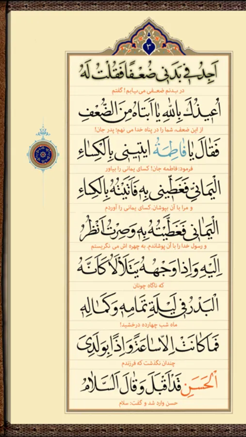 برنامج يعرض نص حديث الكساء بخط جميل جداً وحلّة متميزة مع تلاوة الحديث.