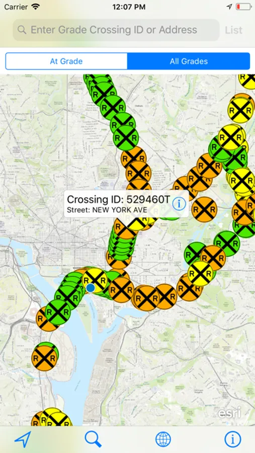 The Federal Railroad Administration (FRA) Rail Crossing Locator helps you locate highway-rail grade crossings and explore detailed information from the USDOT's grade crossing database(s). Users can: locate crossings by USDOT Crossing ID, address or by exploring the map; access inventory records submitted by states and railroads; and view accident history. Users can also select from multiple base maps and identify railroad crossings by their characteristics. This app empowers the public (including transportation, emergency response, and community and safety organizations) to join the FRA's efforts to further improve grade crossing safety and awareness. Please Note: States and Railroads are responsible for the accuracy of the grade crossing physical and operating characteristics within the USDOT inventory records, which are the basis for the information provided in the Rail Crossing Locator app. While the FRA does everything possible to ensure the accuracy of information provided in this app, it is ultimately the crossing owner’s responsibility to provide accurate information to the FRA. FRA assumes no liability for the accuracy of crossing information provided in this app.